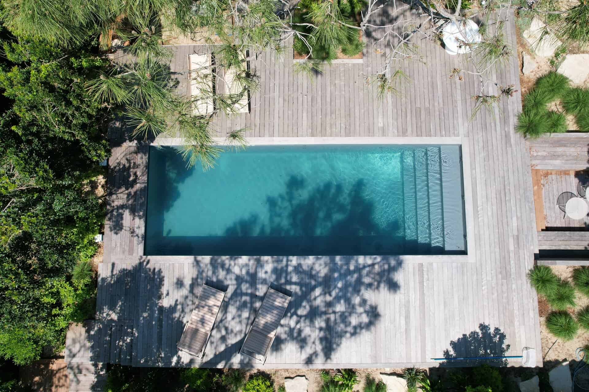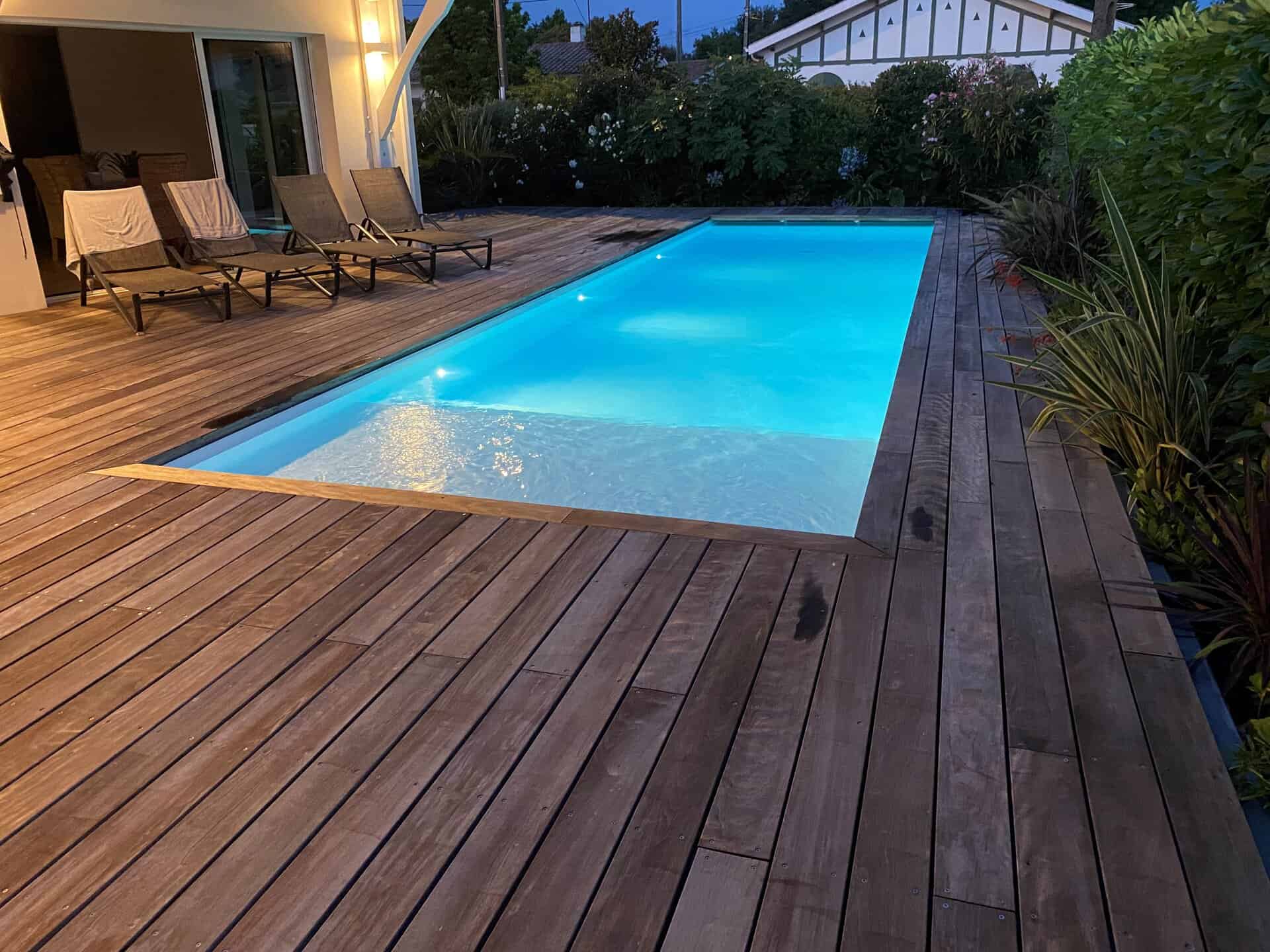 Bassin intimiste, terrasse bois, ambiance tropicale.